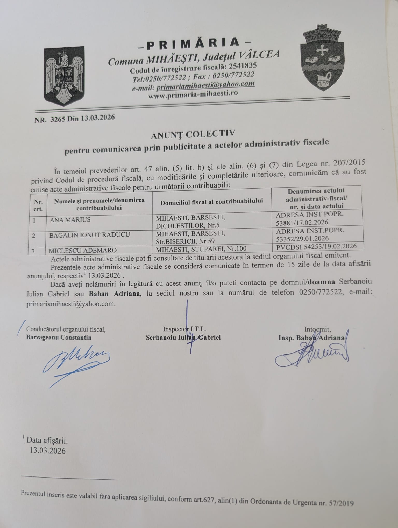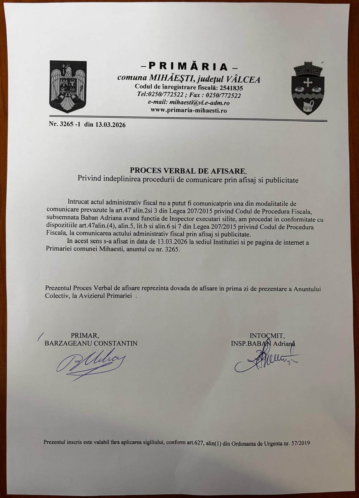 Anunt colectiv pentru comunicarea prin publicitate a actelor administrativ fiscale